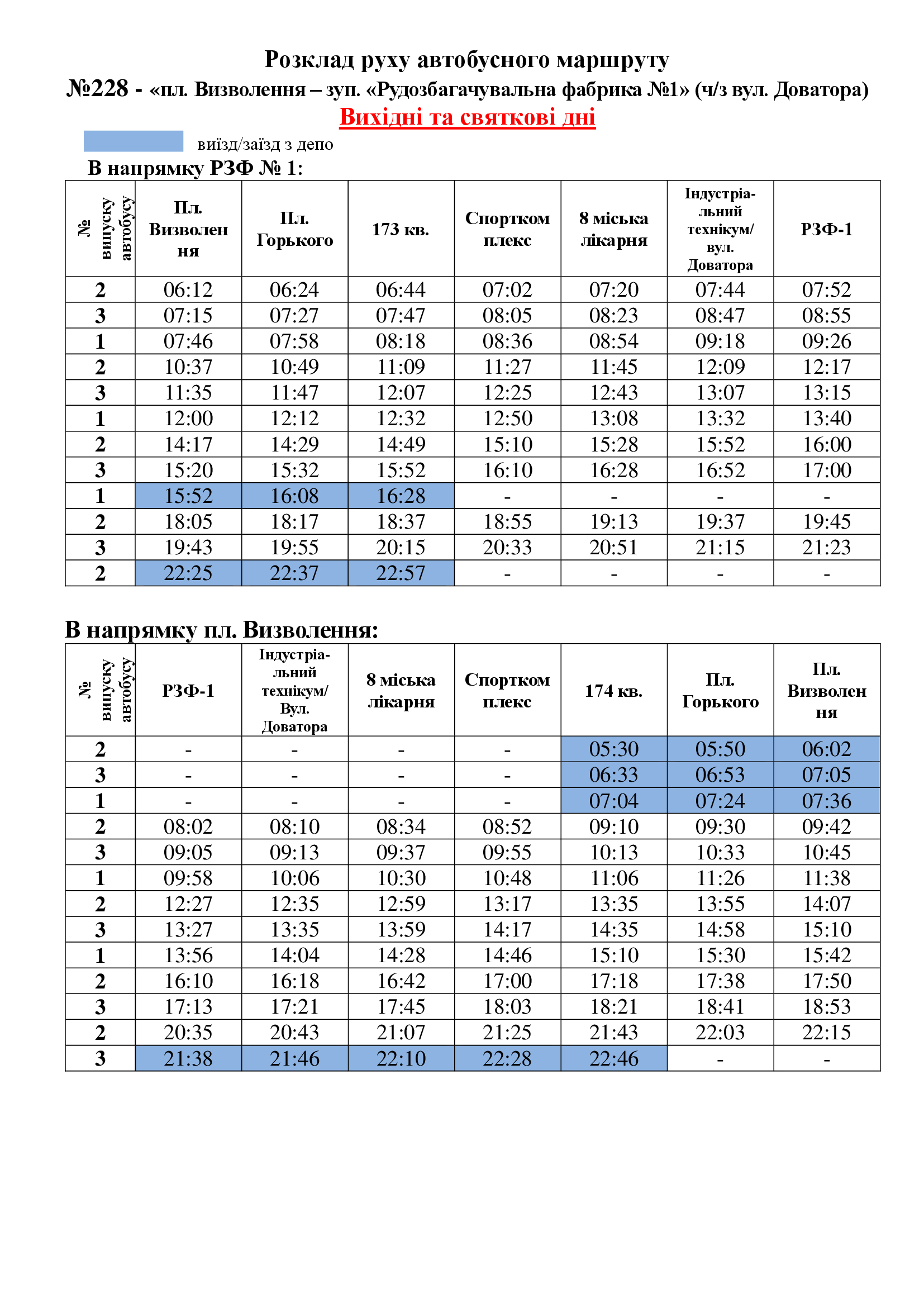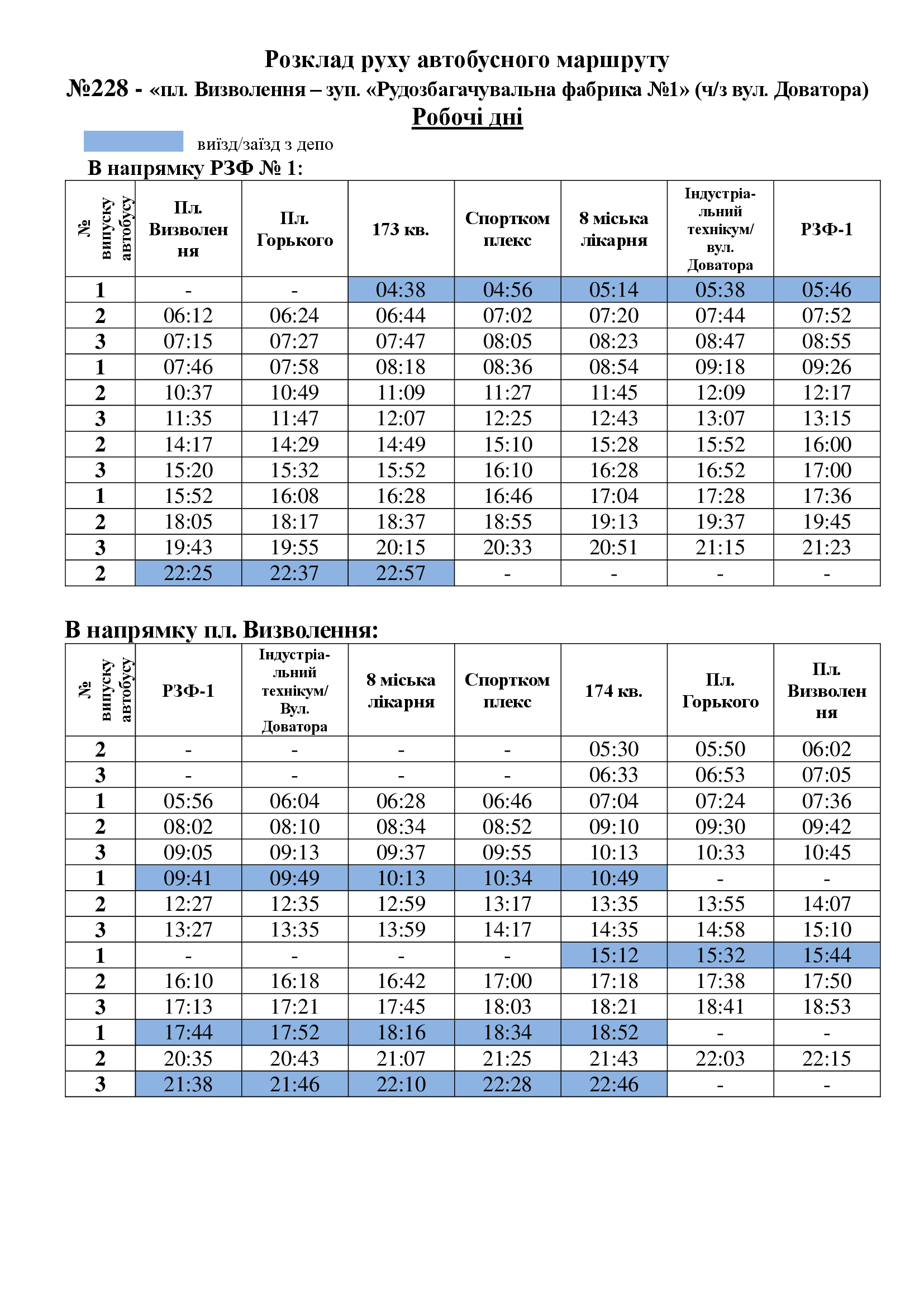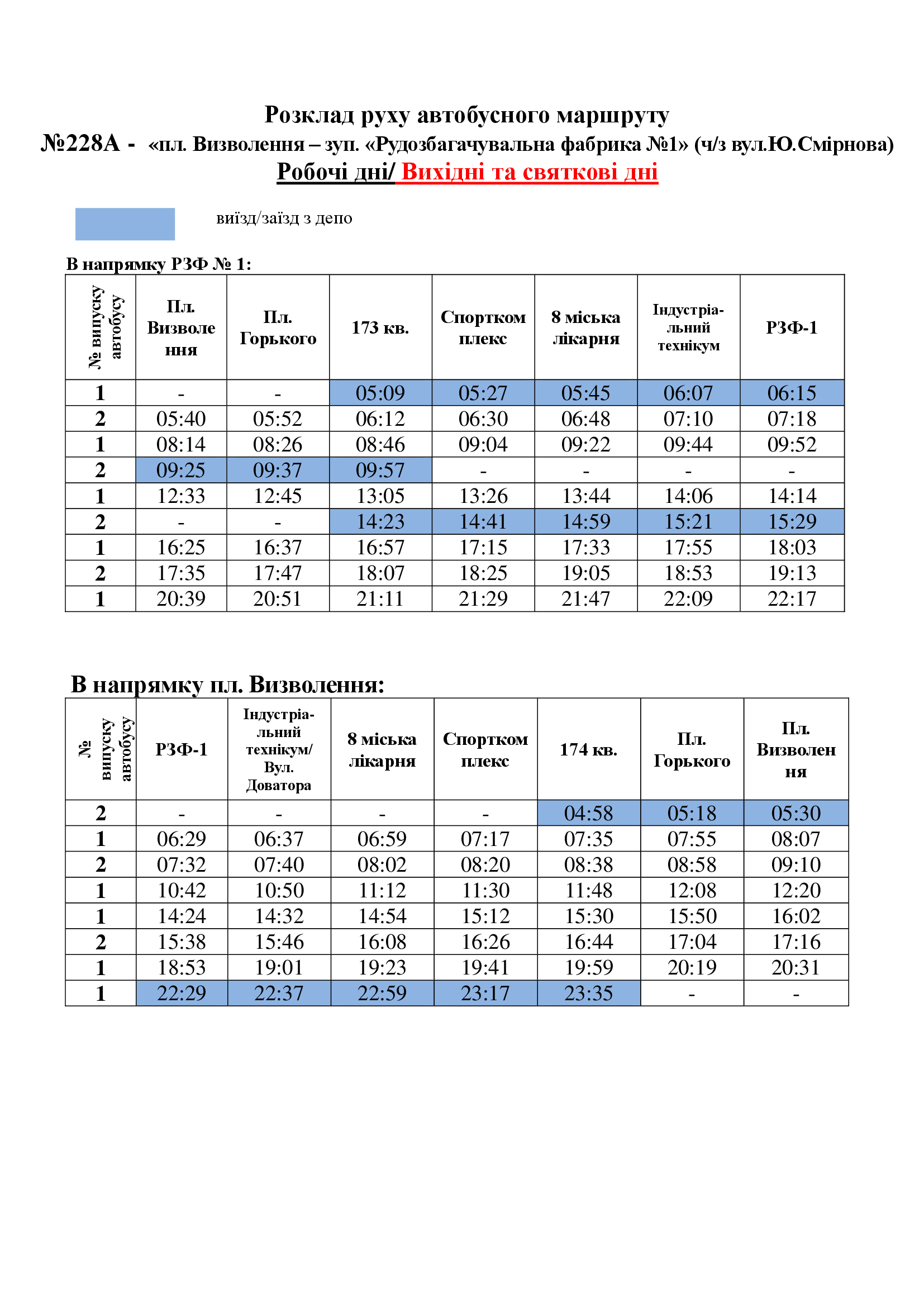 Розклад руху автобусного маршруту №228/228А - «пл. Визволення – зуп. «Рудозбагачувальна фабрика №1»