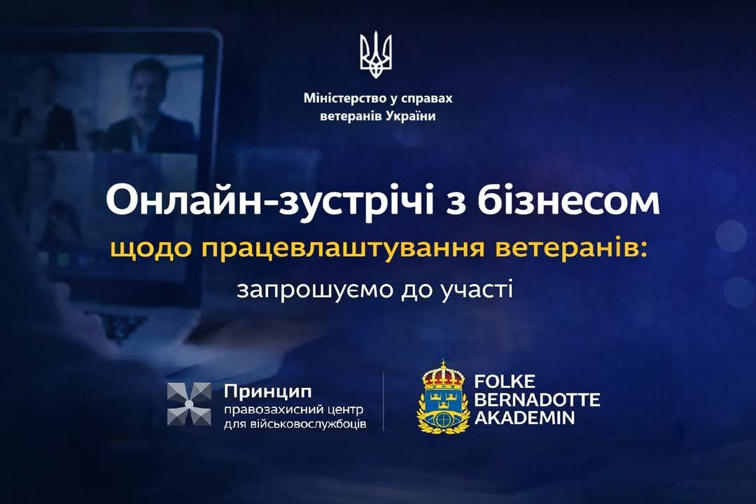 В межах реалізації проєкту за підтримки міжнародних партнерів (Folke Bernadotte Academy) у співпраці з Міністерством у справах ветеранів України та Правозахисним центром для військовослужбовців «Принцип» заплановано проведення онлайн-зустрічей у форматі робочих дискусій із представниками бізнесу, бізнес-клубів та об’єднань роботодавців.