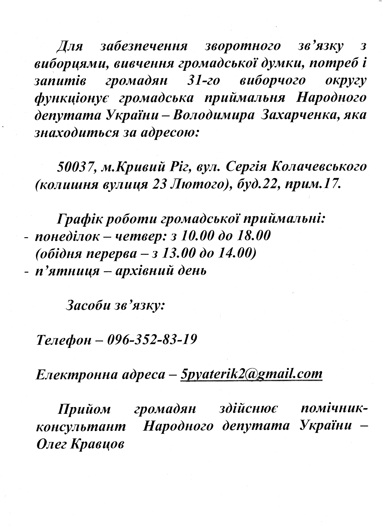 Графік роботи громадської приймальні Народного депутата України - Володимира Захарченка