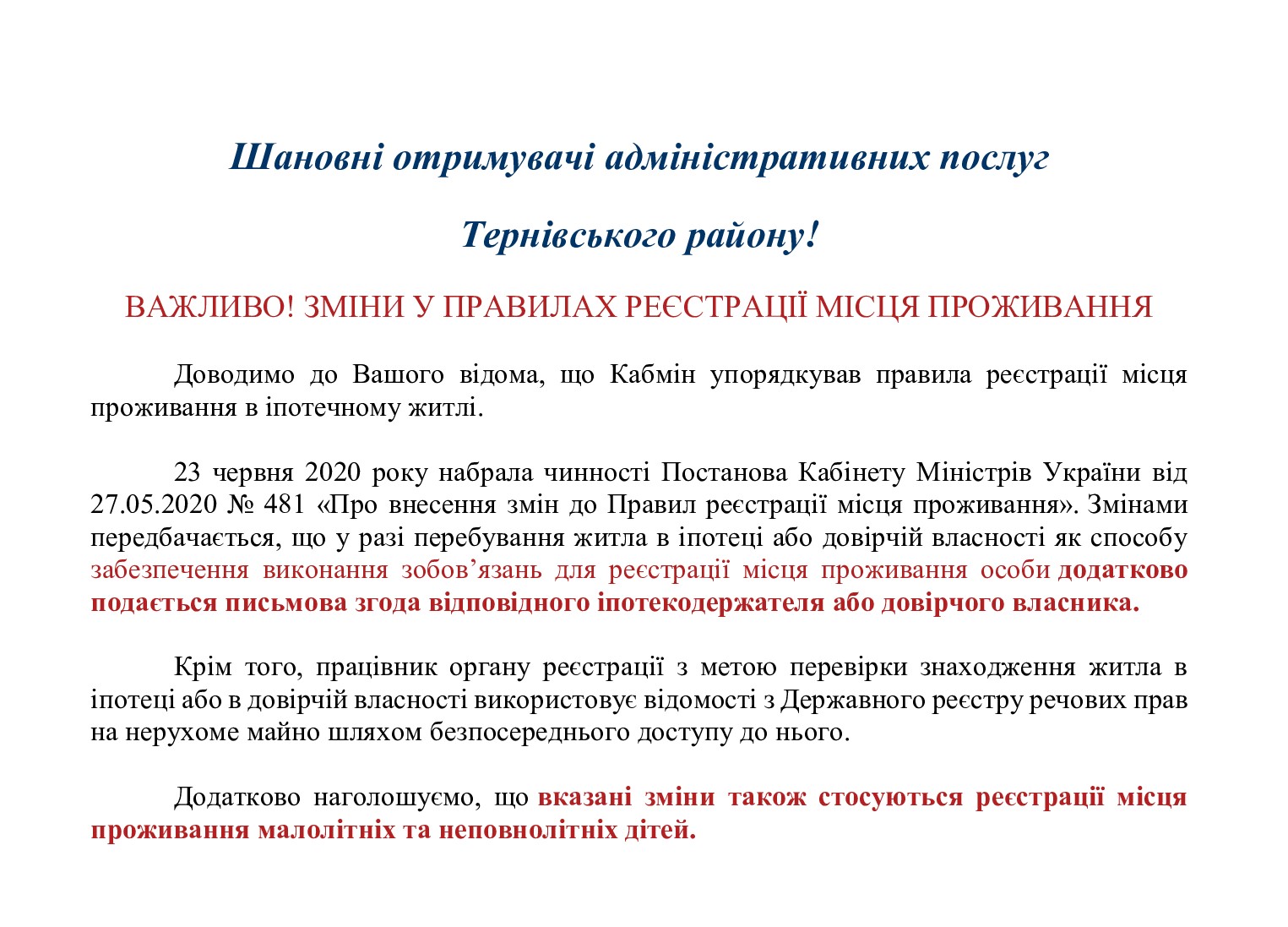 Шановні отримувачі адміністративних послуг Тернівського району! ВАЖЛИВО! ЗМІНИ У ПРАВИЛАХ РЕЄСТРАЦІЇ МІСЦЯ ПРОЖИВАННЯ