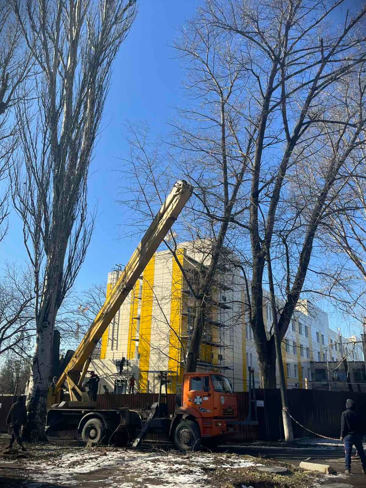 З метою благоустрою території лікарні та приведення її до належного санітарного стану проводяться роботи з омолодження дерев та видалення сухостійних насаджень.