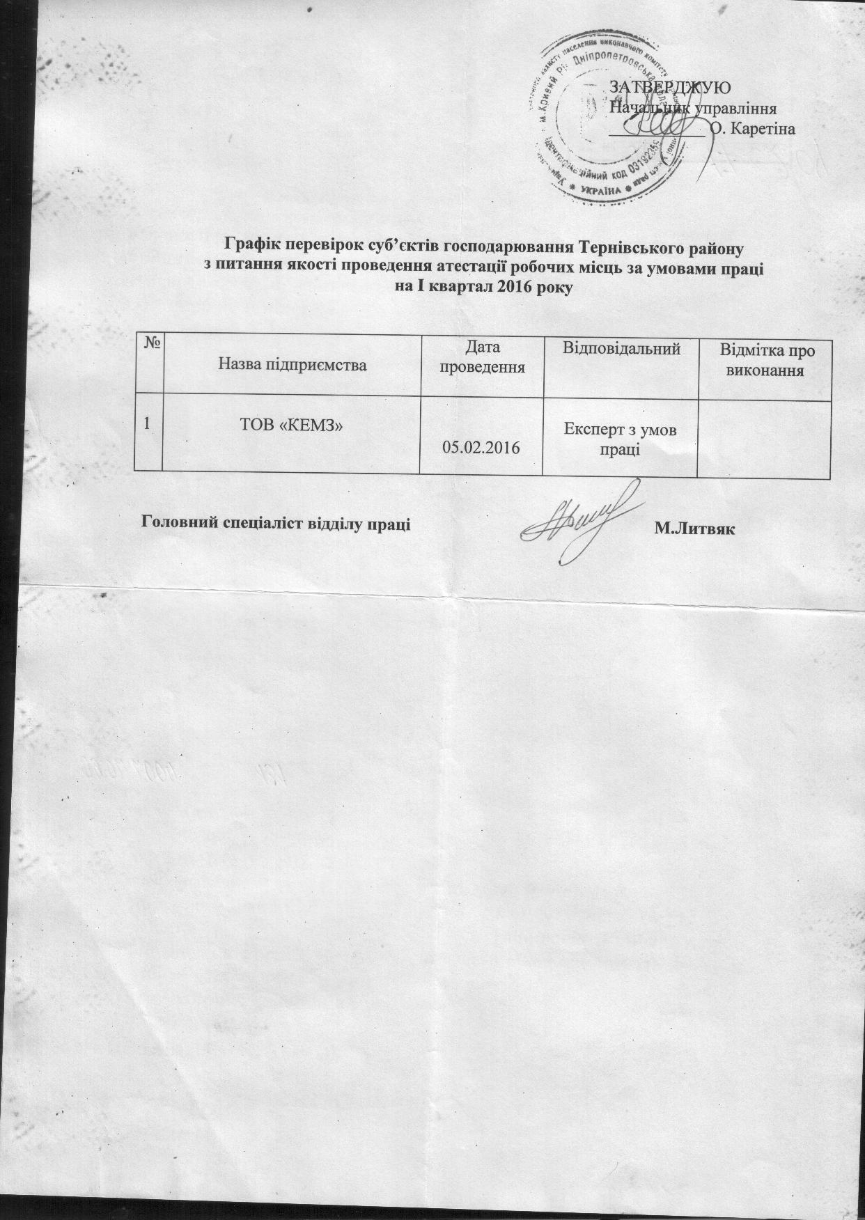 Графік перевірок суб`єктів господарювання Тернівського району з питання якості проведення атестації робочих місць за умовами праці