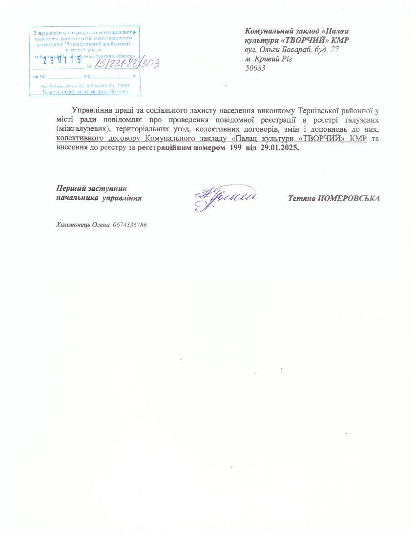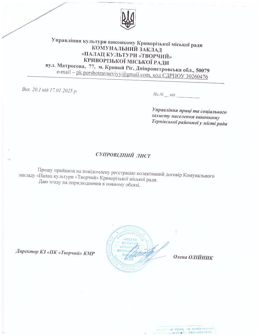 1 | Колективний договір Комунальний заклад «Палац культури «Творчий» Криворізької міської ради Директор – Олена Олійник Голова ПК – Ліна Ткач | Збори трудового колективу від 17.01.2025 №1.1 | Вихід. від 17.01.2025 №20.1 Вхід. від 29.01.2025 №161 | 199 | №15/2.31-22/303 від 29.01.2025 |