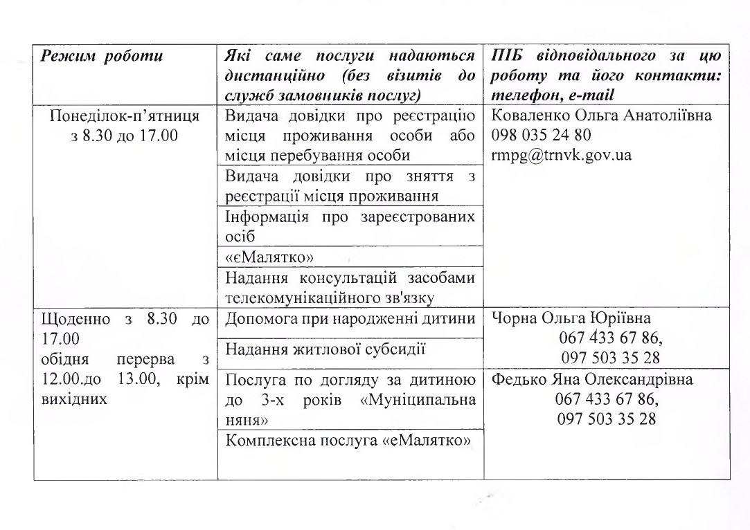 ПЕРЕЛІК ПОСЛУГ ЦАП «Віза», які надаються виконкомом Тернівської районної у місті ради ДИСТАНЦІЙНО